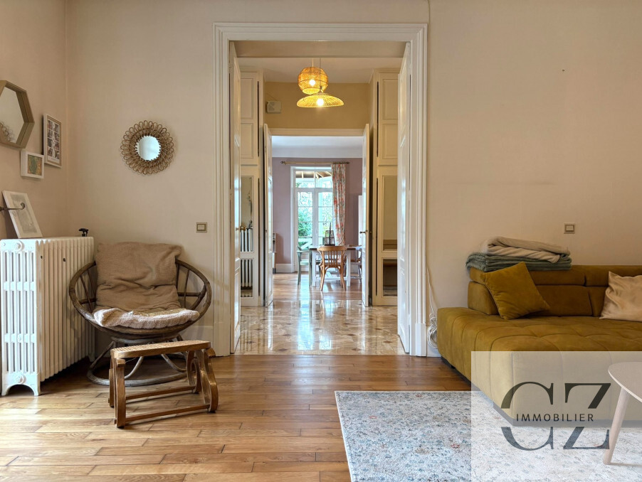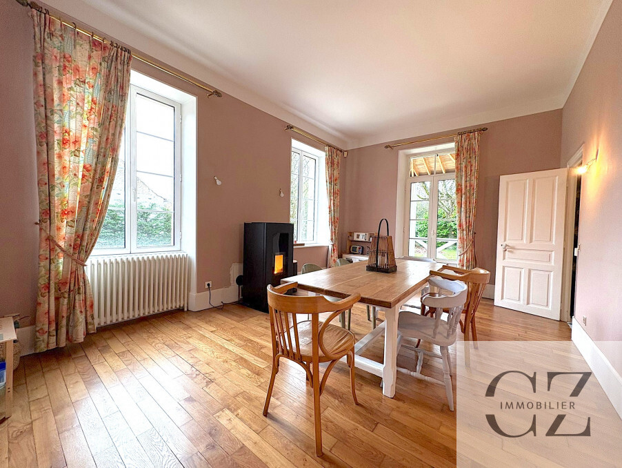 Il se compose d'une maison bourgeoise de haut standing de 212m2 offrant de beaux volumes et comprenant une magnifique entrée avec placards, une superbe salle à manger avec poêle à granulés neuf, un grand salon/séjour, un bureau, une belle cuisine entièrement équipée, ouverte sur une charmante véranda hexagonale offrant une vue imprenable sur le jardin, WC, buanderie, accès sous-sol (chaufferie, cave).