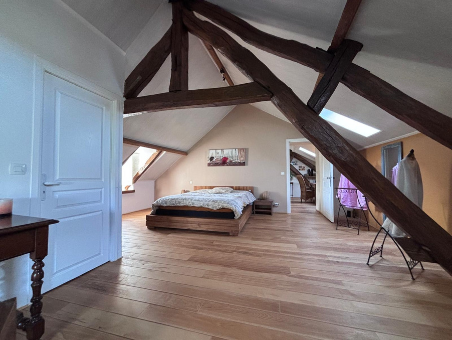 À l'étage une grande mezzanine avec coin bureau dessert une suite parentale de 25 m2 avec salle de bain et WC, une superbe chambre de 36m2 au sol avec dressing, une salle de bain avec douche et WC complètent ce bâtiment. Possibilité 3 ème chambre.